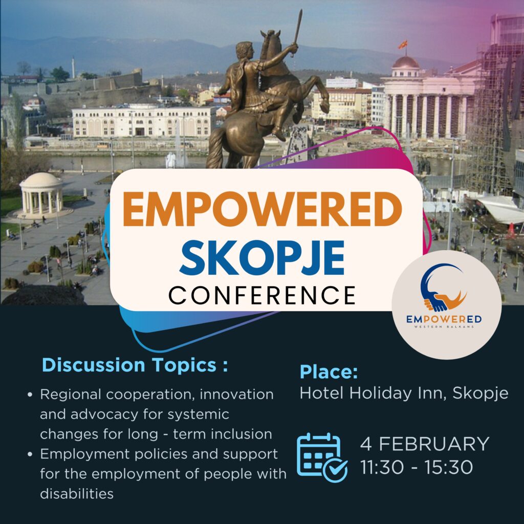 CDI Macedonia, in partnership with Preda Plus and ADRF and with support from partner organisations within the regional EMPOWERED initiative, is organising a trilateral conference dedicated to advancing the inclusion of persons with disabilities and strengthening regional cooperation for sustainable development in the Western Balkans. The event will take place on February 4, 2026, at the Holiday Inn Skopje and continues the series of knowledge‑sharing activities initiated at the regional conference in May 2025 and the trilateral meeting in Sarajevo at the end of 2025. The conference aims to bring together decision‑makers, ministry representatives, organisations of persons with disabilities, experts and private‑sector stakeholders to discuss two thematic sessions — regional cooperation, innovation and advocacy for systemic change, and employment policies and support for the employment of persons with disabilities — and to identify concrete steps for policy harmonisation, exchange of good practices and development of innovative solutions for an inclusive labour market. Special focus will be placed on empowering the participation of persons with disabilities in policymaking, strengthening regional advocacy networks and improving support mechanisms for long‑term inclusion. Organised by CDI Macedonia in cooperation with Preda Plus Foundation and ADRF – Albanian Disability Rights Foundation.